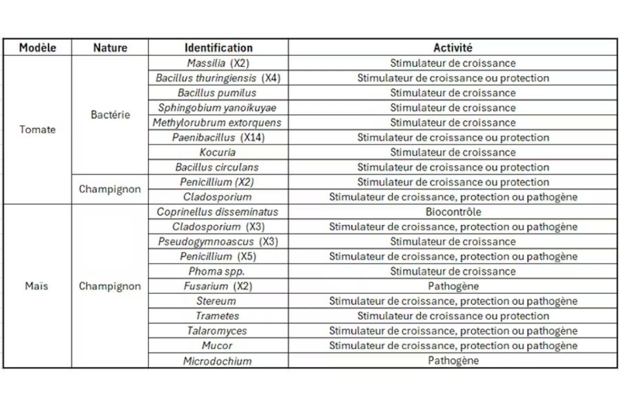Parmi les microorganismes identifiés, plusieurs sont connus dans la littérature et pourraient appartenir aux bactéries ou aux champignons promoteurs de la croissance des plantes et/ou présenter des effets de biocontrôle. D’autres ne sont que partiellement identifiés, et nous ne pouvons donc pas encore savoir s’ils sont bénéfiques ou pathogènes.